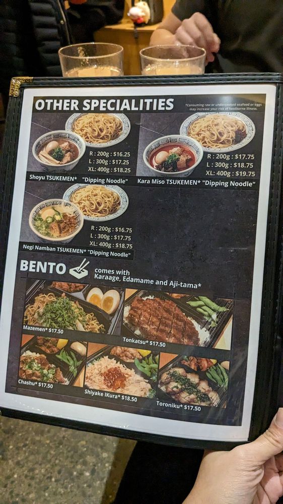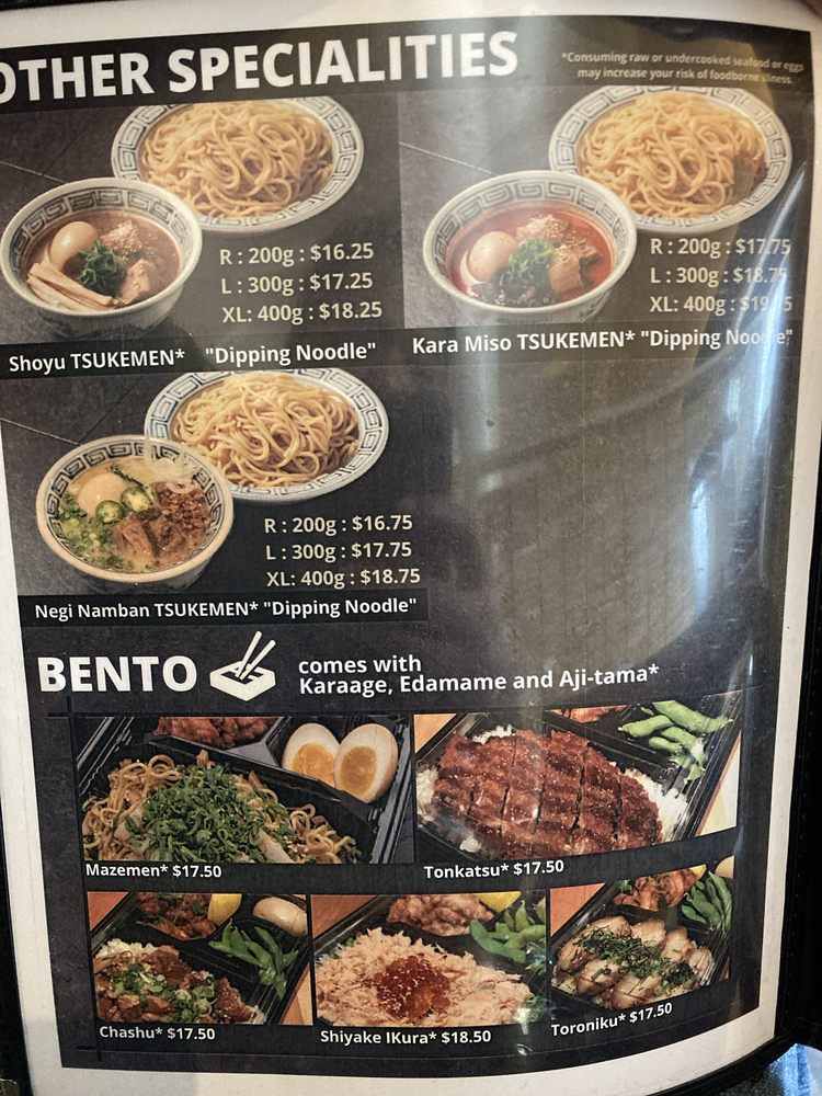 Santouka style Bento Box comes with Mazemen[broth-less noodle dish], Karaage[Japanese Fried Chicken], Edamame[Steamed Soybeans in Pot]and Ajitama[Marinated Soft Boiled Egg] What does "bento" mean? "Japanese Lunch Box" Perfect for enjoying outside, on-the-go, in the office or at home!