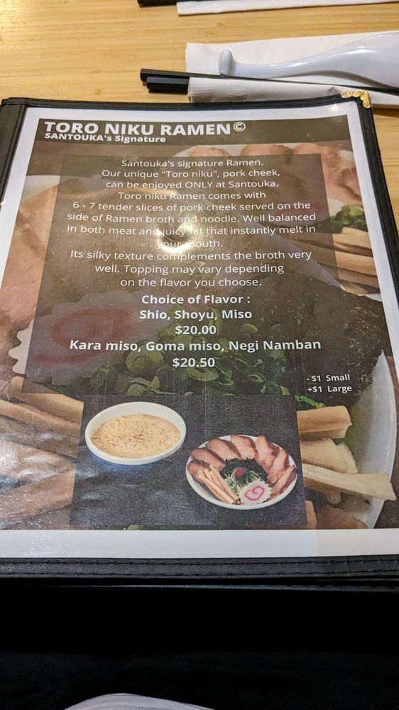 Santouka's signature Ramen. Our unique "Toro niku", pork cheek, can be enjoyed ONLY at Santouka. Toro niku Ramen comes with - tender slices of pork cheek served on the side of Ramen broth and noodle. Well balanced in both meat and juicy fat that instantly melt in your mouth. Its silky texture complements the broth very well. Topping may vary depending on the flavor you choose.